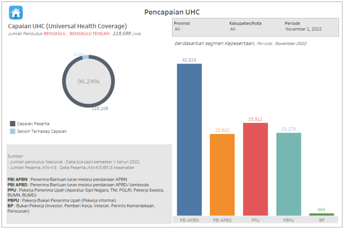Adapun pencapaian UHC Kabupaten Kabupaten Bengkulu Tengah per November 2022 adalah sebesar 96,24 % yaitu 115.108 jiwa dari 119.599 jumlah penduduk Kabupaten Bengkulu Tengah sudah memiliki jaminan kesehatan (peserta JKN/KIS) baik melalui segmen PBI APBN, PBI APBD, PPU, PBPU dan BP.