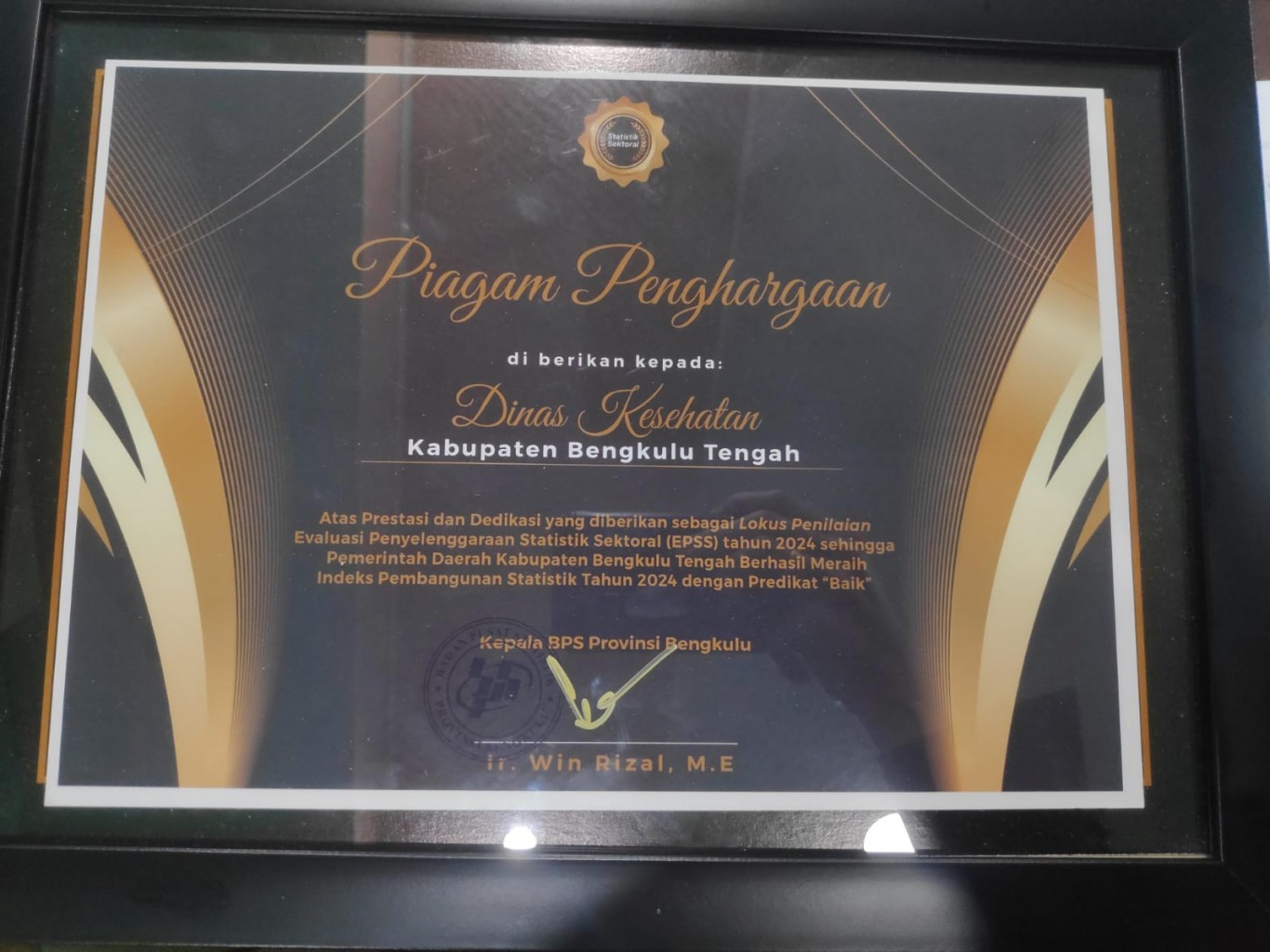 Dinas Kesehatan mendapat Penghargaan sebagai Lokus Penilaian EPPS Tahun 2024, Penghargaan diberikan Langsung Oleh Pj Bupati Bengkulu Tengah